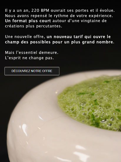 220 BPM est un restaurant gastronomique imaginé par le chef Jérémy Galvan, qui vous propose de bousculer les conventions : Vous ne dînez pas à table, les couverts disparaissent, l’eau est servie dans de singuliers flacons, il n’est plus possible de différencier les cuisiniers des serveurs, car ici, tous les repères sont bousculés.